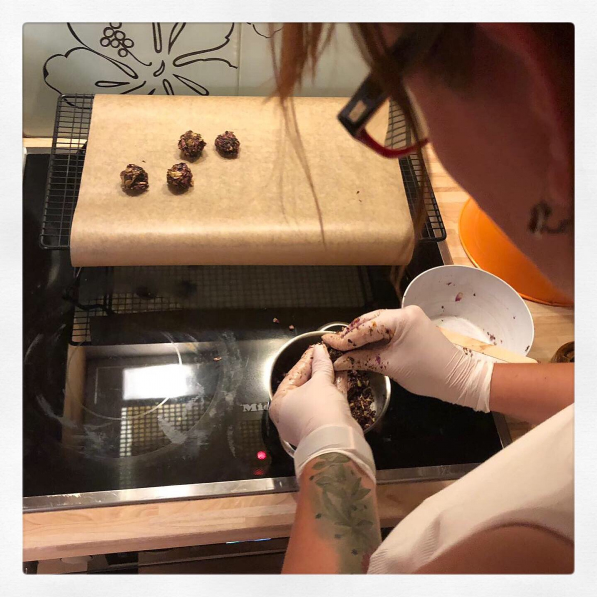 Als alles fast miteinander verschmolzen war, gab ich die anderen Zutaten mit hinzu und habe zügig alles zusammen mit Hilfe eines Holzspatels grob vermischt. Dann habe ich aus dem Gemisch mit den Händen die kleinen Kugeln geformt und auf ein Backpapier gelegt, wo sie trocknen können. Alternativ kann man die Masse auch in eine Silikonform für Eiswürfel drücken und erkalten lassen, so dass sie die Form behalten.