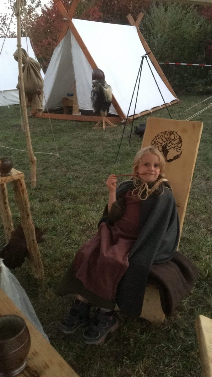 Die Tochter Lagiatha Svendotir geht richtig auf, wenn sie dabei sein darf. Manchmal könnte man meinen, sie ist in der falschen Zeit geboren, denn im Lager lebt sie, als würde sie nichts anderes kennen. Sie ist immer in der Nähe von Kindern anderer Sippen, der Bühne mit ihren Gauklern und Barden oder unserer Oma Hilde. Sie ist ebenso die Patentochter der Sippe Audur Feaddur bzw. von unserer lieben Freundin Hexe Felis und ihrem Gemahl Tjark.