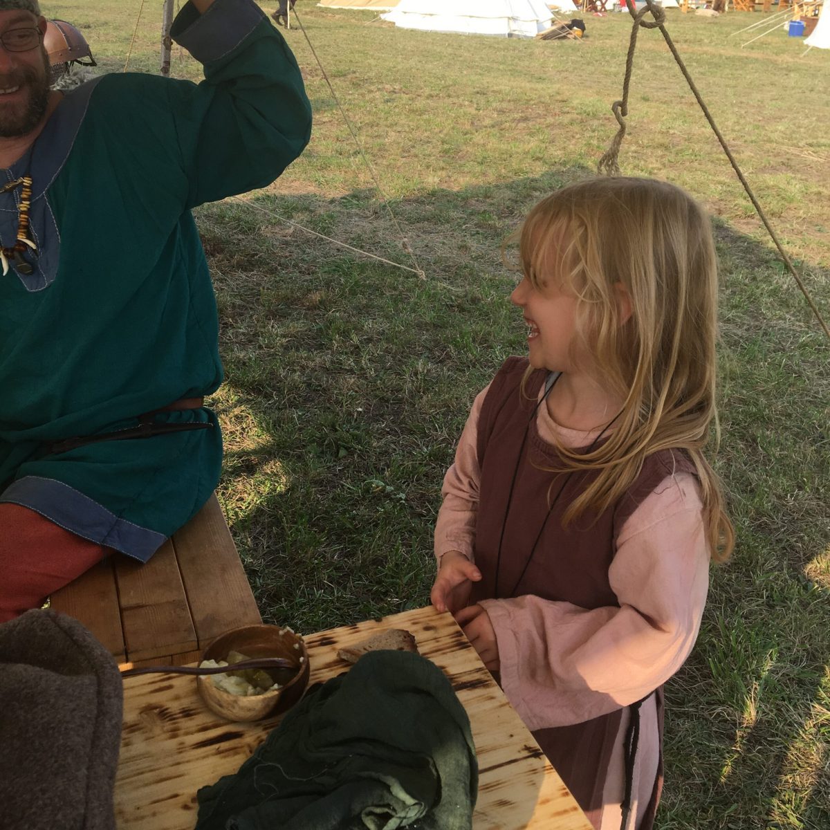 Die Tochter Lagiatha Svendotir geht richtig auf, wenn sie dabei sein darf. Manchmal könnte man meinen, sie ist in der falschen Zeit geboren, denn im Lager lebt sie, als würde sie nichts anderes kennen. Sie ist immer in der Nähe von Kindern anderer Sippen, der Bühne mit ihren Gauklern und Barden oder unserer Oma Hilde. Sie ist ebenso die Patentochter der Sippe Audur Feaddur bzw. von unserer lieben Freundin Hexe Felis und ihrem Gemahl Tjark.