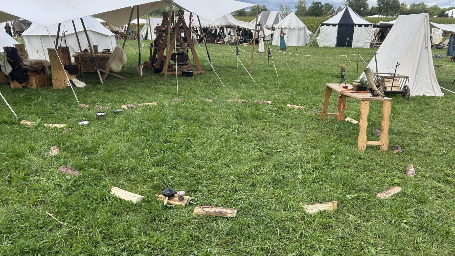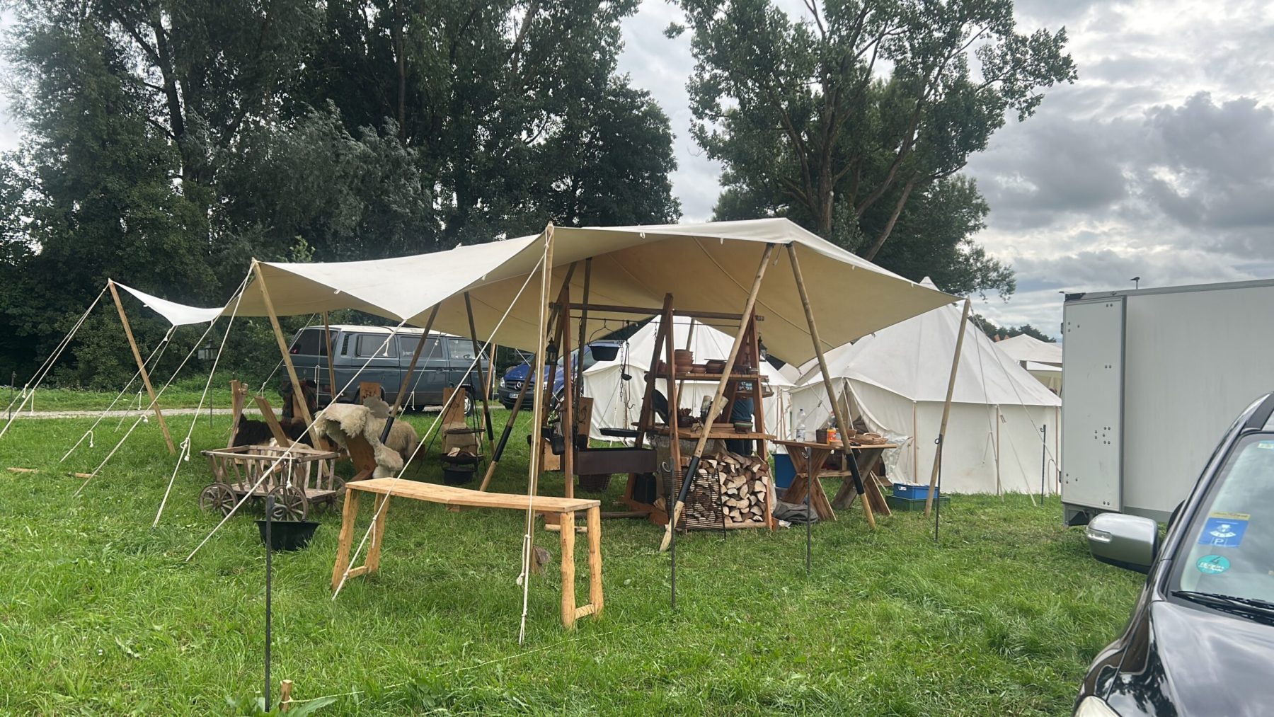 Der Aufbau unseres Lagers auf 15x15m war in knapp 3,5h erledigt und wir trafen bereits die ersten bekannten Gesichter. Mit den direkten Nachbarn freundeten wir uns links und rechts von uns auch schnell an. Danke für die tolle Nachbarschaft an dieser Stelle! Leider gab es auch weitere Nachbarn, mit denen man sich nicht so wohlfühlen konnte – nächtliche Lautstärke bis in die frühen Morgenstunden sei „Dank“. Und es macht es auch nicht sympathischer, wenn man sich auch noch doof grinsend über uns oder unsere übernächtigten Kinder und den Schlafmangel lustig macht. Wenn es sich vermeiden lässt, möchten wir nicht mehr auf einem Markt sein mit dieser Lagergruppe! Aber das weiß man ja leider meist erst, wenn es zu spät ist.
