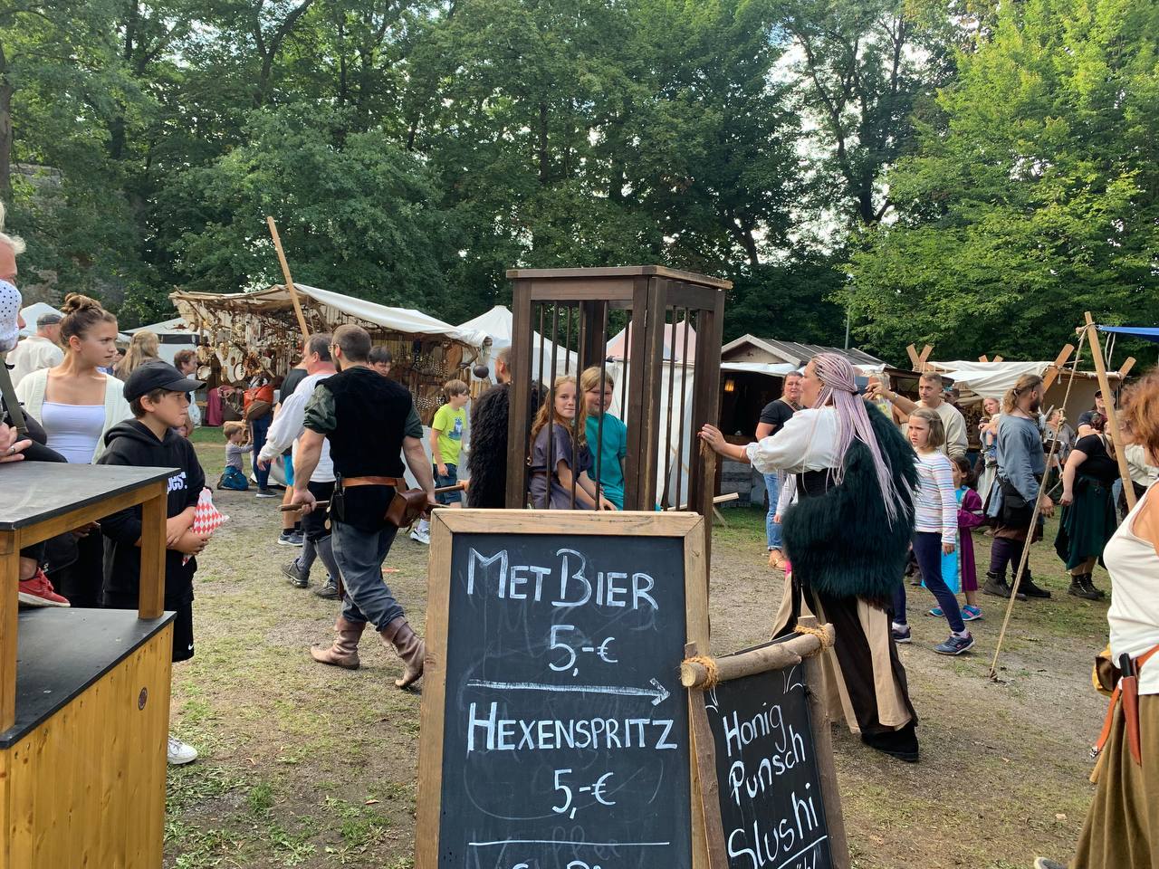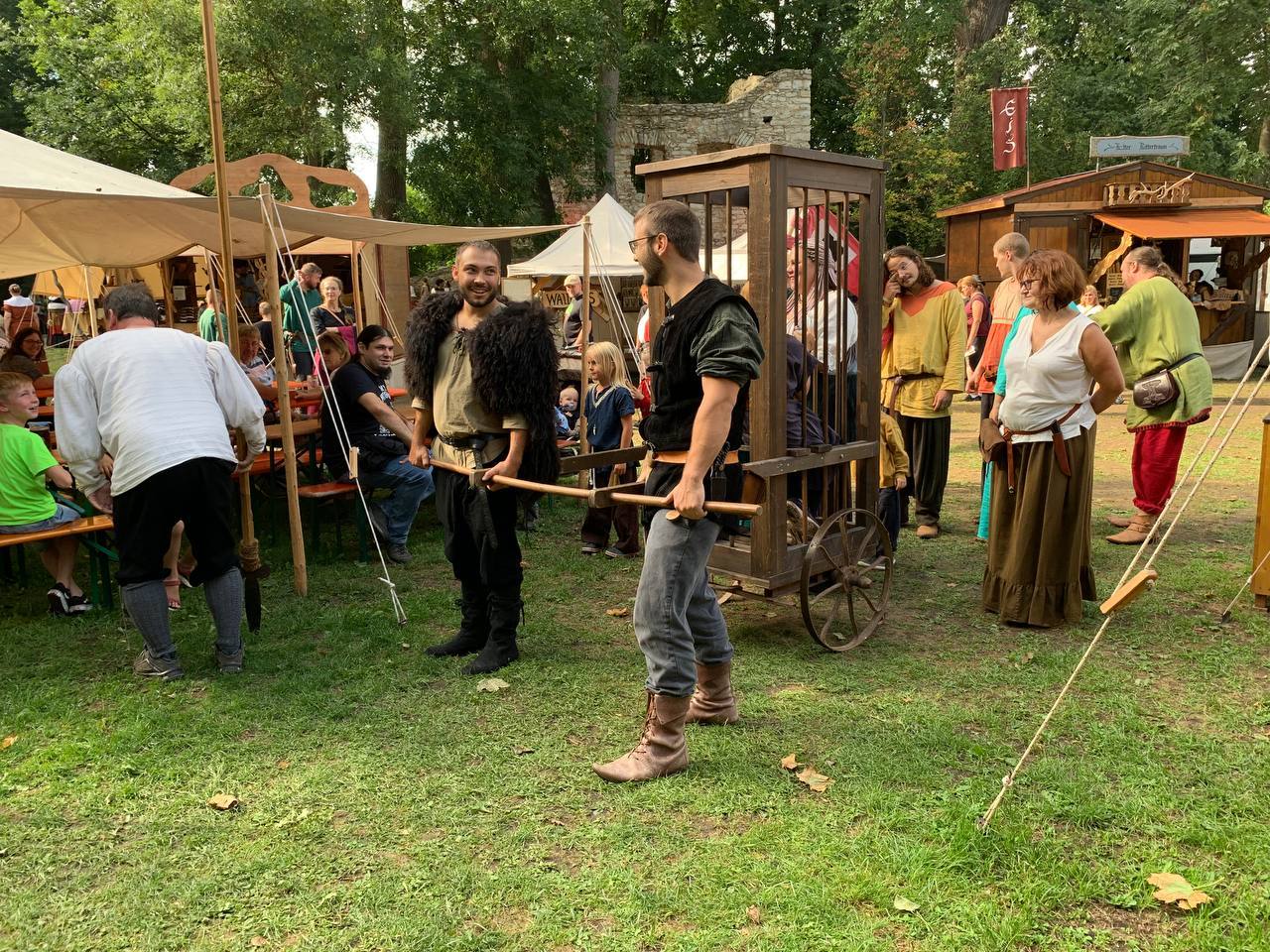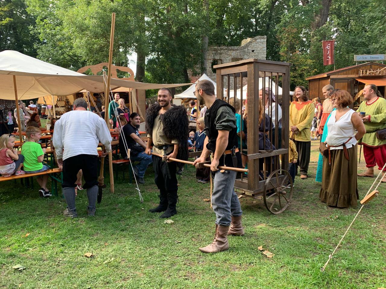 Auch wurde unsere Laune nur kurzzeitig aus den Angeln gehoben, als es am Freitag kurz um Marktbeginn einen Sturm mit Gewitter gab. Wir kamen mit einem großen Schrecken und einem dicken Ast eines Baumes auf unseren Zelten davon. Nicht auszudenken, was gewesen wäre, wenn eines der Kinder im Zelt gewesen wäre… Aber die Kinder und alle Erwachsenen waren während dem Sturm und Gewitter in Sicherheit! Sofort eilten mutige Helfer mit Axt und Sägen daher und befreiten unsere Zelte von dem schweren Ungetüm. Da möchte ich noch einmal meinen tiefsten Dank aussprechen! Auch für die tröstenden und beruhigenden Worte von Claudia aus selbigem Lager nebenan! Vielen Dank!
